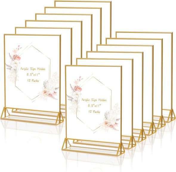 LOT E-789-D - Gold Frames Clear Acrylic Sign Holder 8.5X11 Gold Picture Frames, Double Sided Menu Display Stand for Weddings Table Number Flyer Holder (Pack of 12)