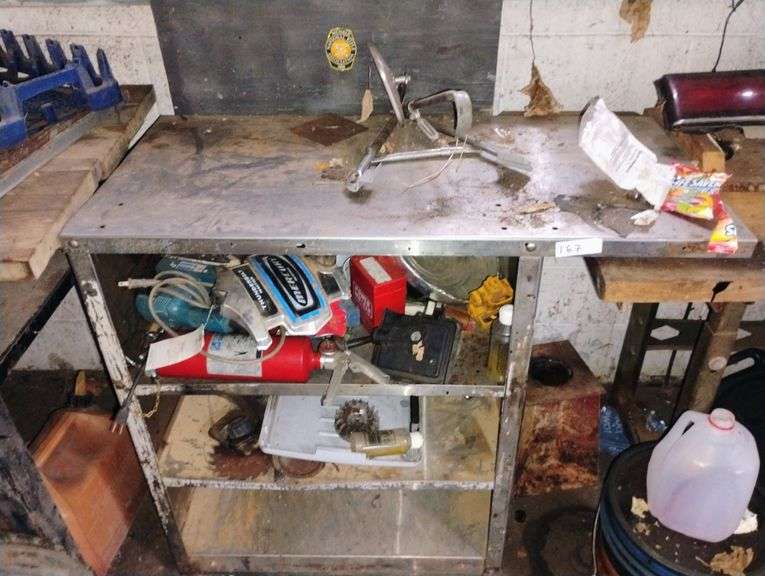Stainless steel shop table with shelves and contents fire extinguisher etc