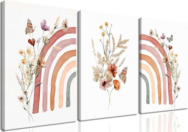LOT E-69 - AKWISH Boho Rainbow Wall Art for Girls Room - Set of 3 Framed Wildflower Canvas Prints for Nursery, Baby Girl Room, Kids or Dorm Decor - Soft Pastel B