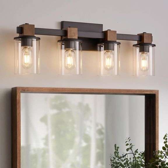 LOT B-130-G - PUNSOKO Farmhouse Vanity Light Fixture, 4 Light Bathroom Wood Wall Light Over Mirror with Clear Glass Shade, Rustic Bathroom Vanity Light (Antique Woo