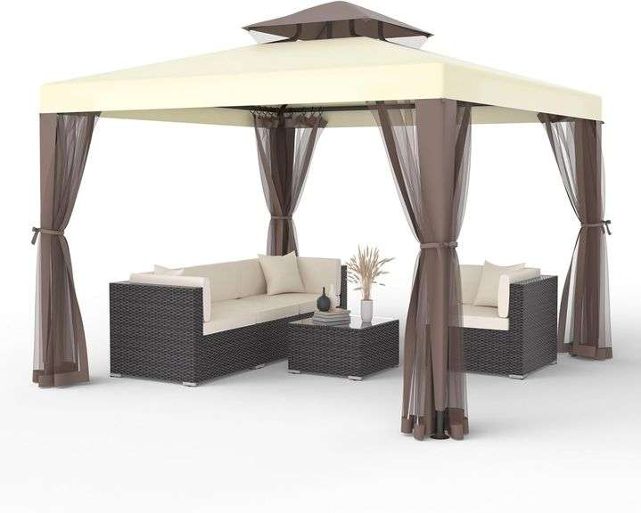 LOT B-117-G - Gazebo, 10'x10' Canopy Tent Waterproof UV-Resistant 2-Tier Top Sturdy Outdoor Canopy Shelter for Camping w/Mosquito Netting for Garden Patio Backyard(