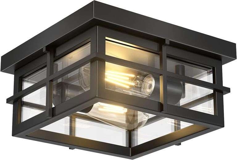 LOT E-780-D - Asnxcju Modern Outdoor Ceiling Light Fixtures, 2-Light Black Flush Mount Light Fixtures with Clear Glass Shade, Farmhouse Square Ceiling Lighting for