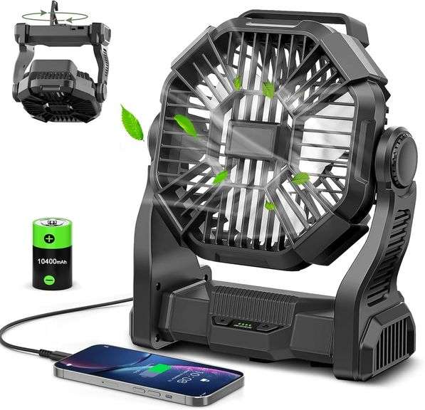 LOT O-153-D - CONBOLA Portable Rechargeable Camping Fan for Tent, 10400mAh Battery Operated Outdoor Fan with Hanging Hook, LED Lantern, 270 Rotation, 10-Inch Small